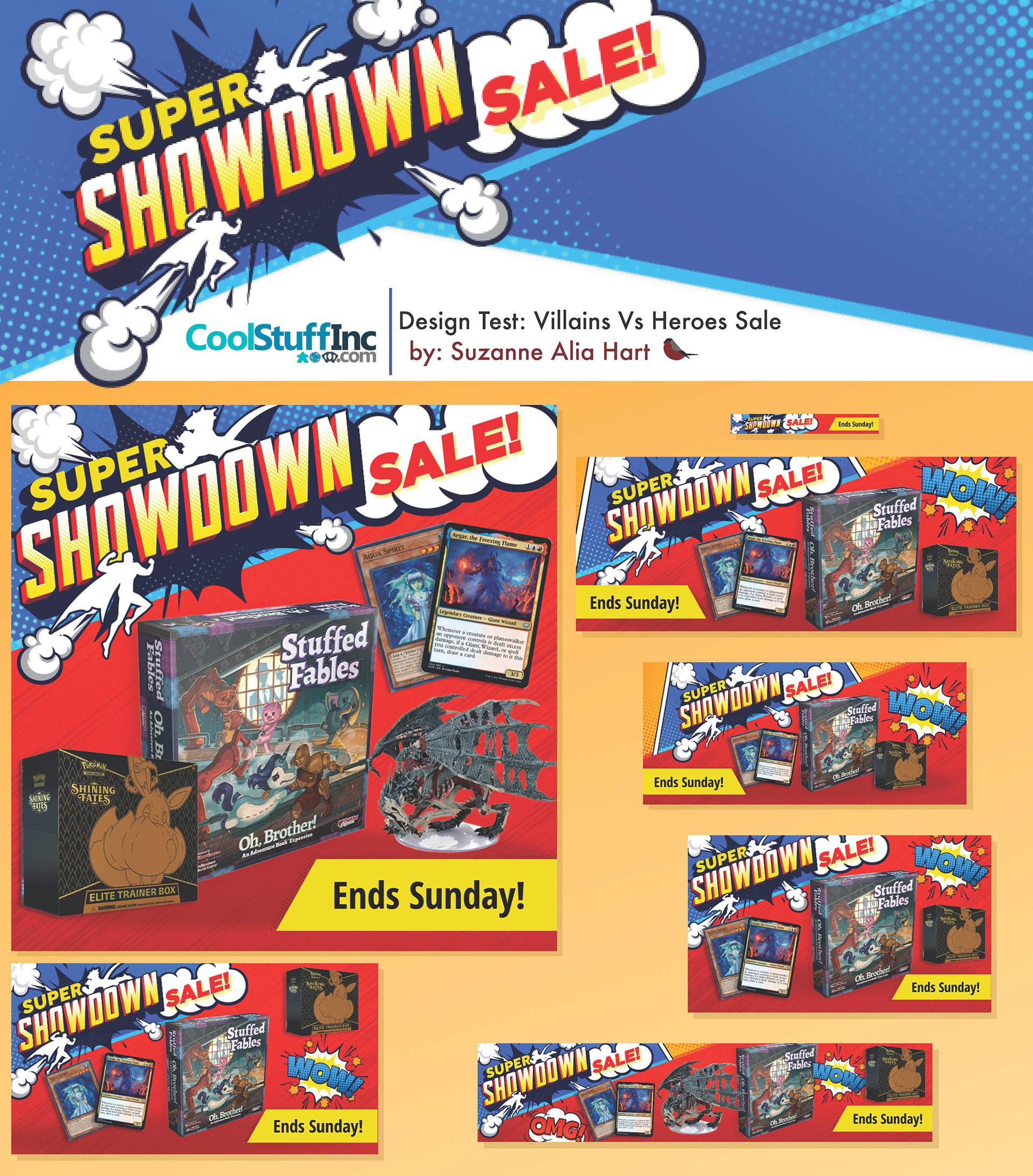 This was the design test that I used to apply to the job. I was able to repurpose these graphics for the Heroes' Vs. Villians Sale.