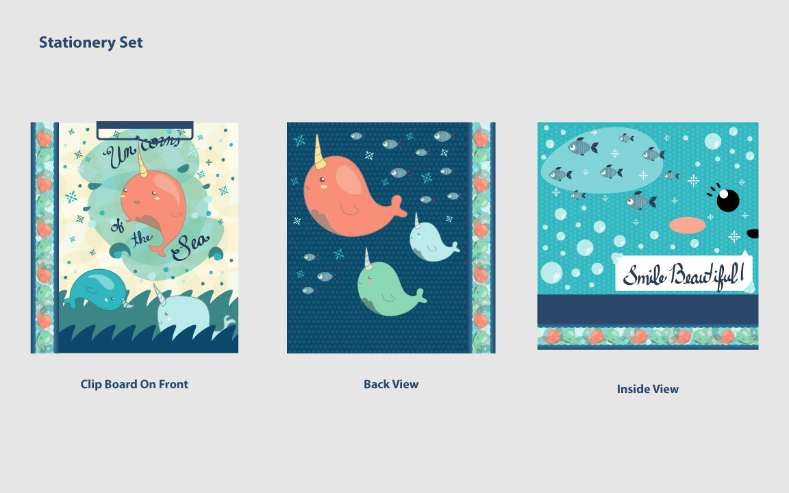 This is a stationery set that was designed for Scholastic. The theme for the box was narwhals with an underwater element. The front box is hand-lettered along with the inside. Inside the box are letters and envelopes with stickers, eraser tops, and stamps. It was overall designed for little girls.